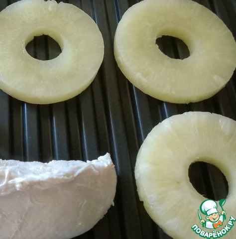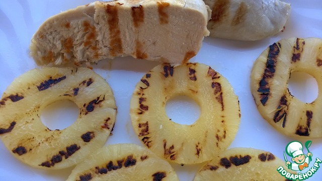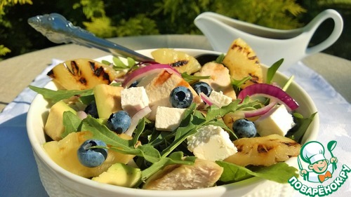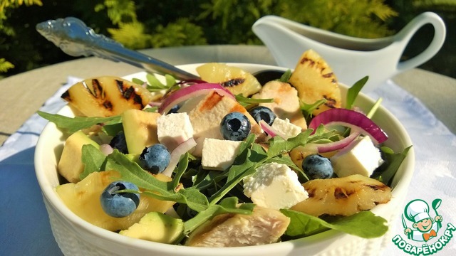 Обжариваем на большом гриле с обеих сторон. У меня была отварная грудка, но по рецепту необходимо обжарить на гриле сырую грудку. Приблизительная обжарка по 5 минут с каждой стороны. Дайте остыть 10 минут. Нарежьте ананас и курицу на средние кусочки. Посолите и поперчите. Соедините с авокадо, луком, фетой и голубикой.