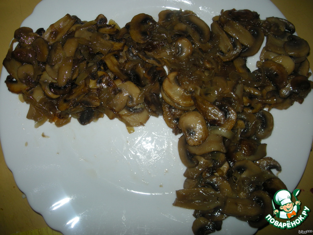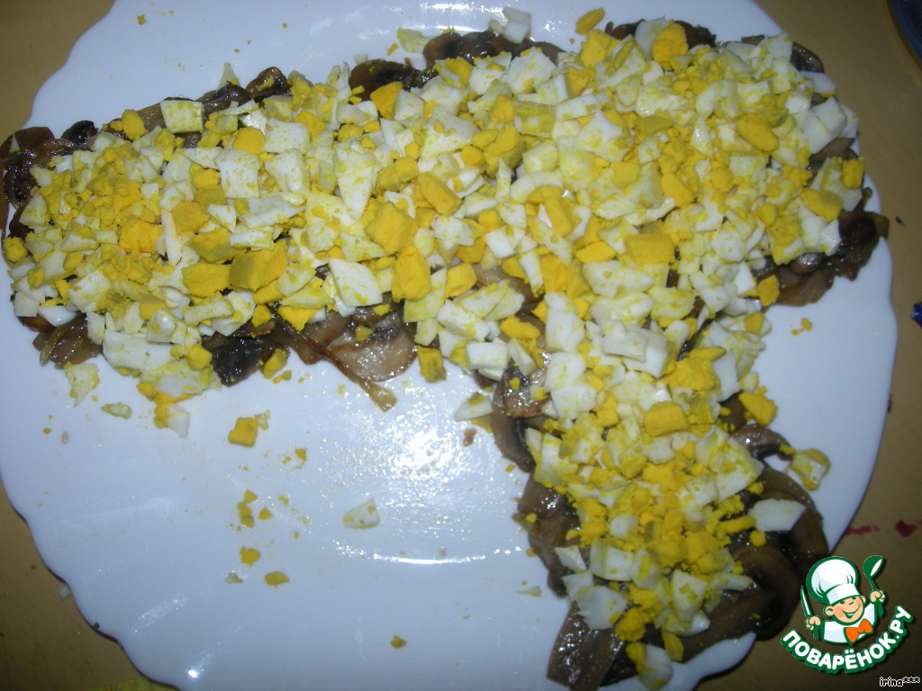 Выкладывать салат слоями, в форме пистолета, каждый слой поливая майонезом: