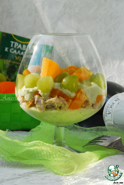 | Фруктовый салат с курицей. Очень сочный, сытный и довольно легкий салат. Рецепт этого блюда был размещен на сайте в 2008 году пользователем zmeiyka2008 под названием "Салат из авокадо и курицы" и иллюстрирован мной в рамках акции "Раскраски". |