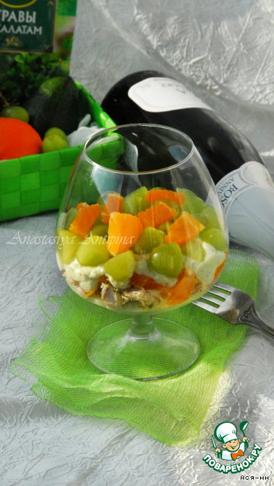 Для порционной подачи в бокал (креманку или салатник) на дно выкладываем немного соуса из йогурта и авокадо, затем слой куриного филе, мандарины, еще немного соуса и разрезанный пополам виноград. Украшаем дольками мандарина и подаем.