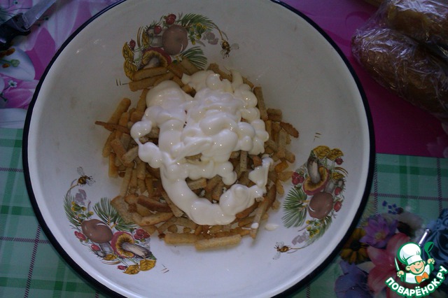 Выкладываем сухарики в миску и поливаем майонезом.
