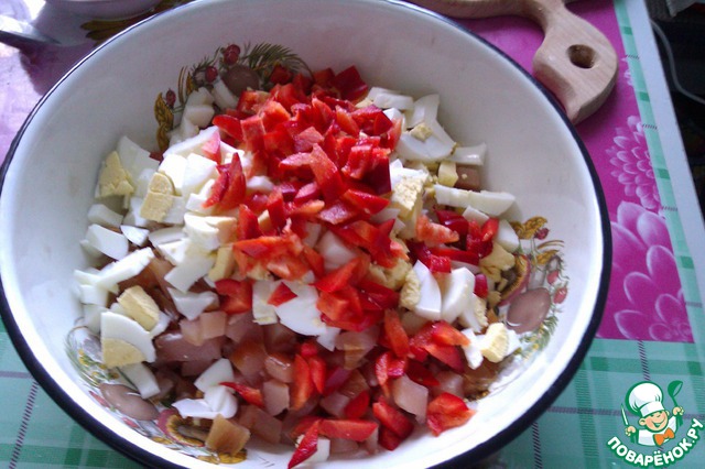 Режем филе, яйца, перец кубиками и добавляем к сухарикам.