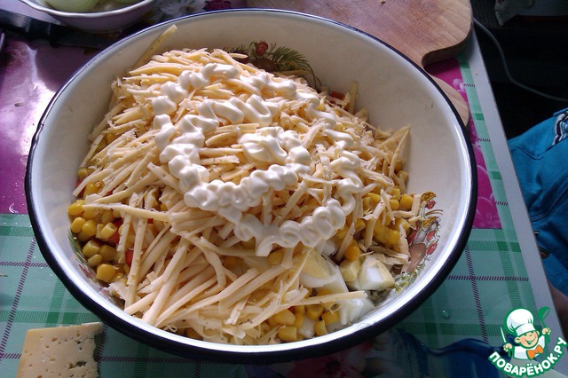 И натертый на терке сыр, сверху еще полить немного майонезом. Перемешиваем.