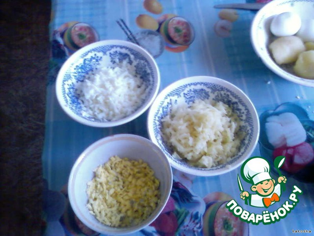 яйца разделить на белки и желтки и натереть отдельно на терке.