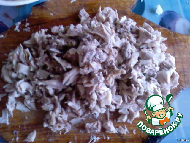 Отварное куриное мясо измельчить, у меня были окорочка (2 шт.).