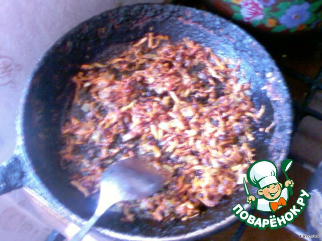 Лук обжарить на растительном масле, добавить морковку, обжарить и пусть остывает.