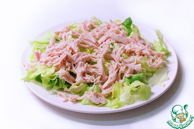 Следующий слой - куриное филе. В указания к ингредиентам я отметила, что его нужно отварить и "разобрать" на волокна, можно, конечно же, и порезать - тут как кому хочется. Ну и, собственно, выкладываем на листья салата. Можно немножко поперчить.