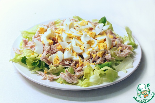 Почти финальный этап - яйца. Я их резала произвольно и довольно мелко. Готово? Теперь поливаем сверху оливковым маслом (немножко, конечно же), сбрызгиваем уксусом (лучше всего специальным для салатов и ни в коем случае не эссенцией!), выжимаем прям на салат сок от половины лимона (разумеется, если раскладывать порционно, а не смешивать салат в одной чашке, то половины лимона должно хватить на все порции).