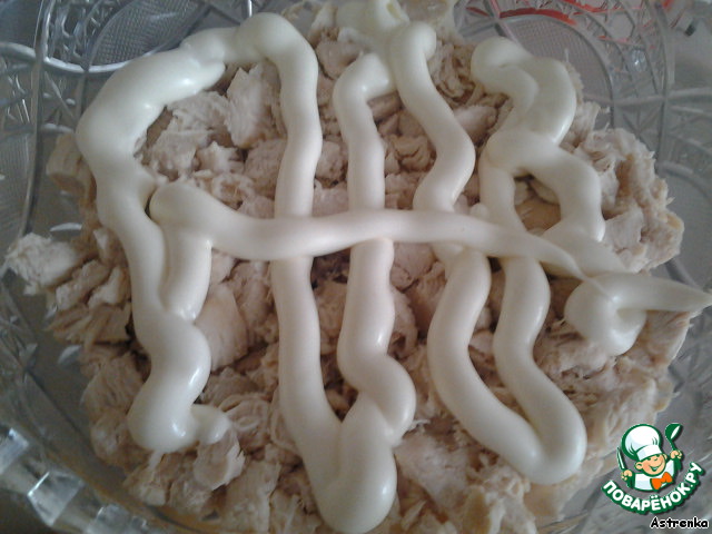Следом идет куриная грудка. Этот слой смазываем майонезом.