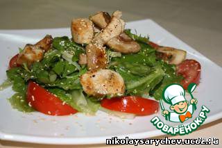 1.Куриное филе нарезаем кубиком и обжариваем на оливковом масле с шампиньонами,солим,перчим.Выкладываем на салат.Посыпаем кунжутом.