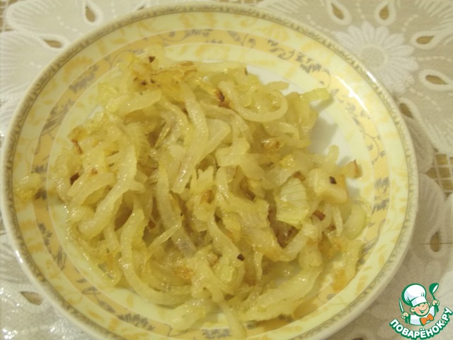 Лук режем полукольцами и жарим на растительном масле на медленном огне до прозрачности периодически помешивая, затем слегка подрумяниваем и отбрасываем на дуршлаг, чтобы стекло лишнее масло.