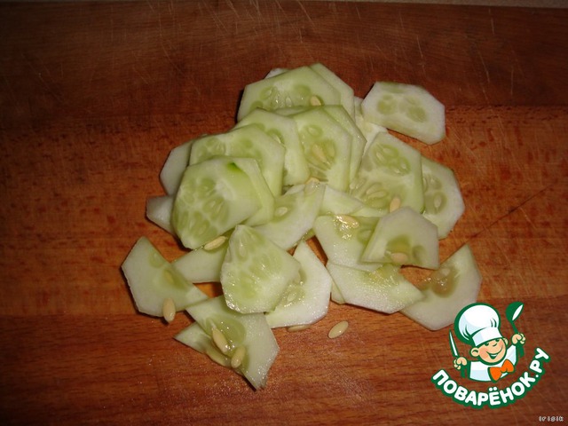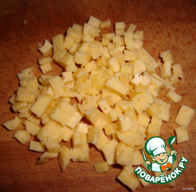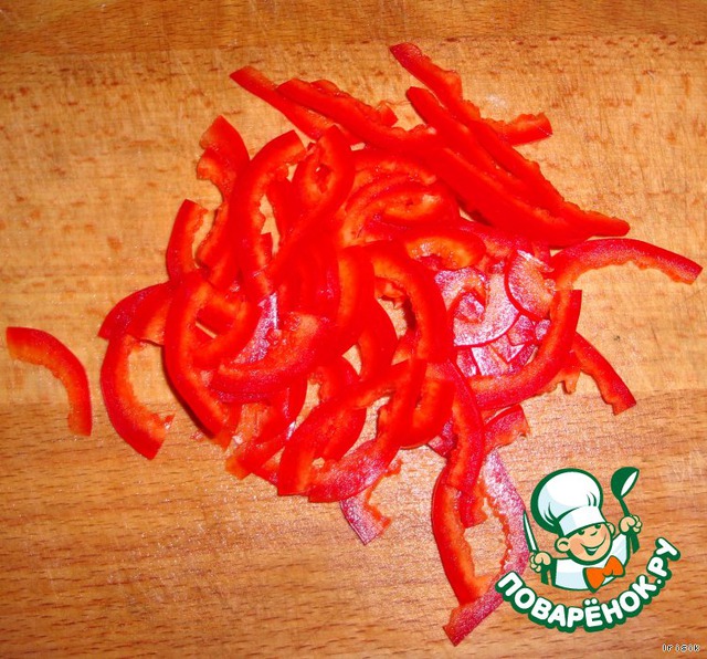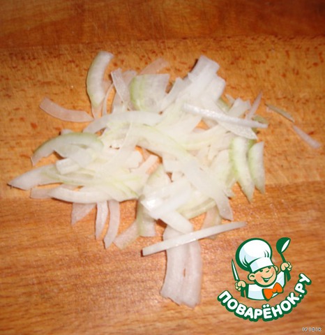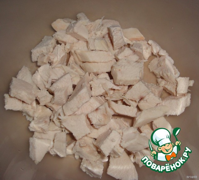 Отвариваем куриное филе, нарезаем соломкой или кубиками.