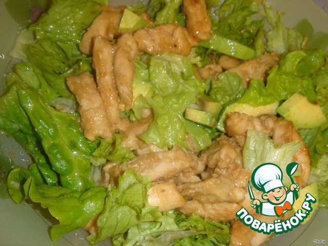 | Очень вкусный салатик из заправленной горчицей и медом куриной грудки, авокадо и хрустящих листьев салата. |