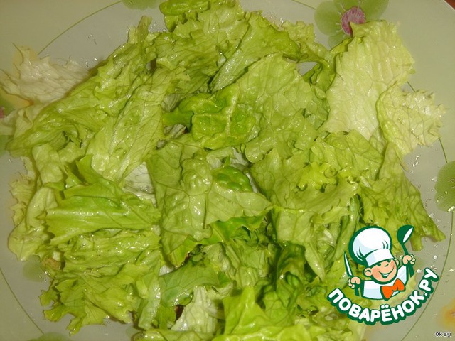 Салат порвите руками и выложите в большое блюдо или большую глубокую тарелку.