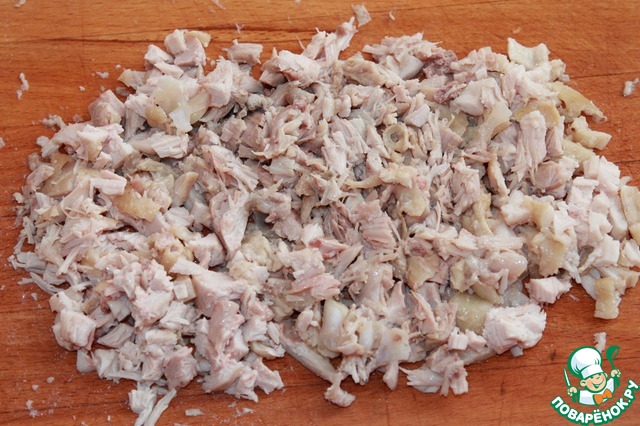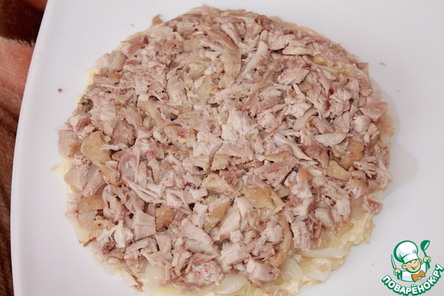 Третьим слоем мы укладываем курицу и смазываем слой майонезом. Если вы используете грудку, то лучше смешайте ее с майонезом, а только после этого укладывайте как слой.