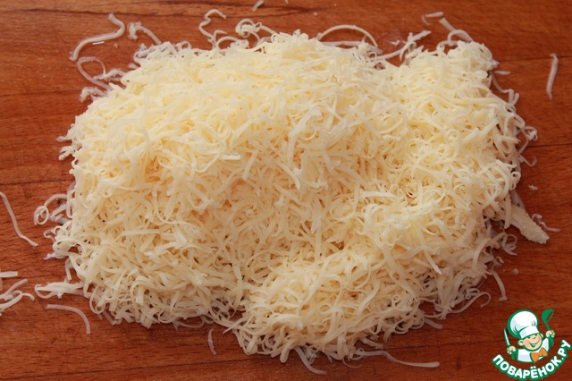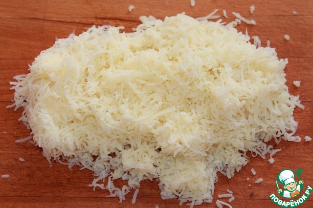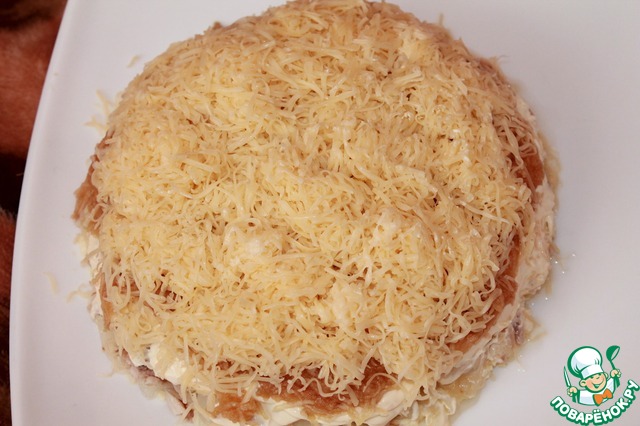 Четвертый слой натертое яблоко. Пятый слой натертый сыр. После чего смазываем майонезом. Шестой слой у нас будет белковый омлет нарезанный мелко. Его укладываем сверху седьмым слоем.