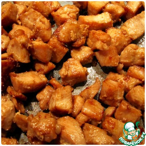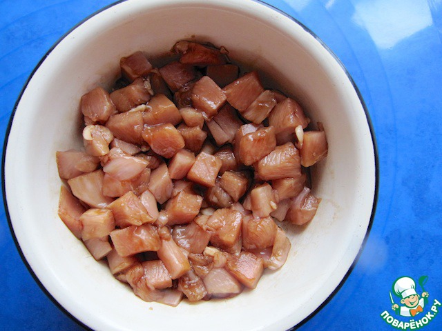 Куриное филе нарезать кубиками, замариновать в соевом соусе на 30 минут.