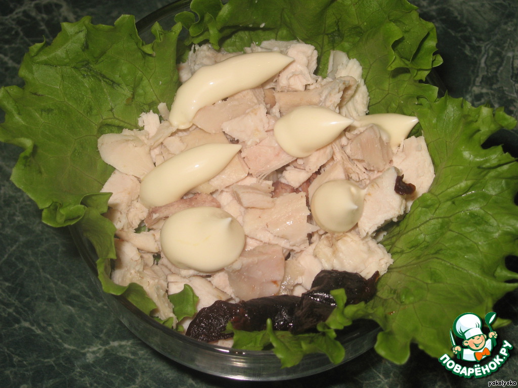 Выстелить креманку листьями салата. Сверху положить курятину, добавить несколько капель майонеза