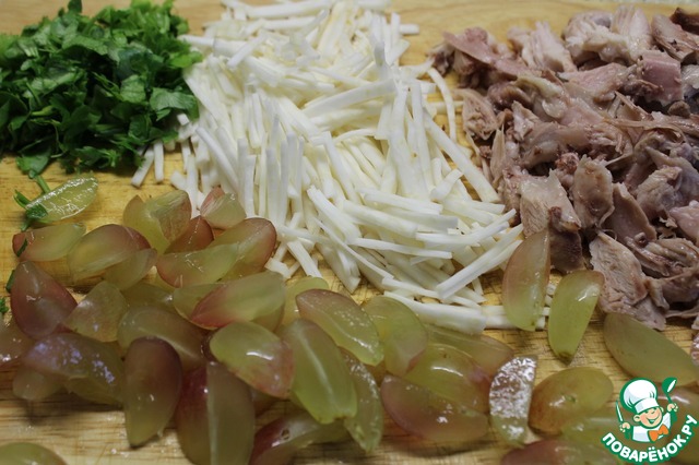 Нарезать мякоть курицы на небольшие ломтики, сельдерей - соломкой, виноград - четвертинками, зелень петрушки мелко порубить.