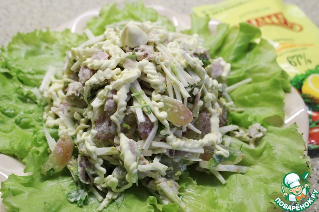 Выложить салат горкой на салатные листья, украсить, просыпав салат луком, тонкими полосками майонеза и ягодами винограда.
