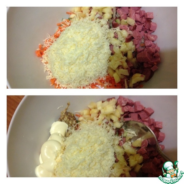 Добавить порезанный кубиком ананас и натертый сыр на мелкой терке. По вкусу добавить перец и соль. Заправить майонезом и горчицей. Аккуратно перемешать.