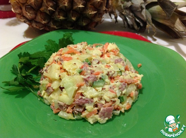 | В итоге новогодних праздников всегда остаются продукты, которые не использовали до конца. Вот открыли банку, не дорезали колбасу, и ананас остался не доедененным, а гости без конца идут и не видно конца и края! А уже и отдохнуть охота, и хозяйкой хорошей выглядеть, и чтобы не избито и удивить! Вот этот рецепт для вас! Просто, доступно и точно под рукой в праздничные дни! |