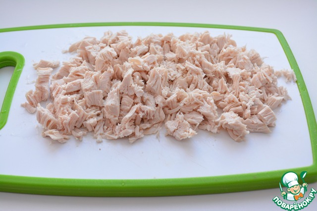 Куриное филе я отварила в подсоленной воде, добавила черный перец горошком, лавровый лист и 2 зубчика чеснока.