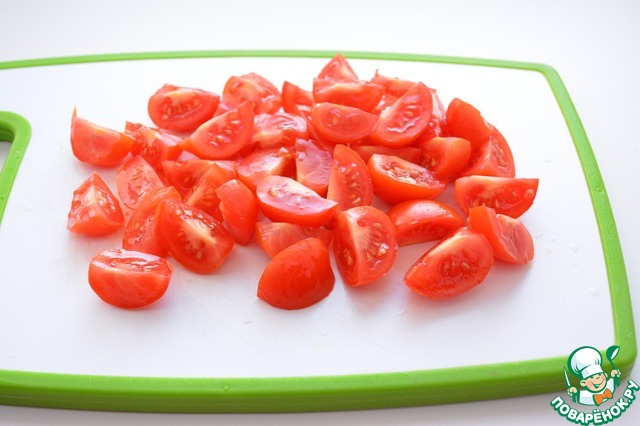 Моем и каждую разрезаем на 4 части помидоры черри.