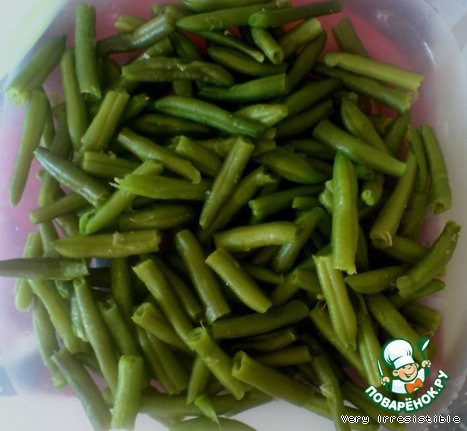 Фасоль отвариваем в подсоленной воде, режем на кусочки длиной 2-3 см.