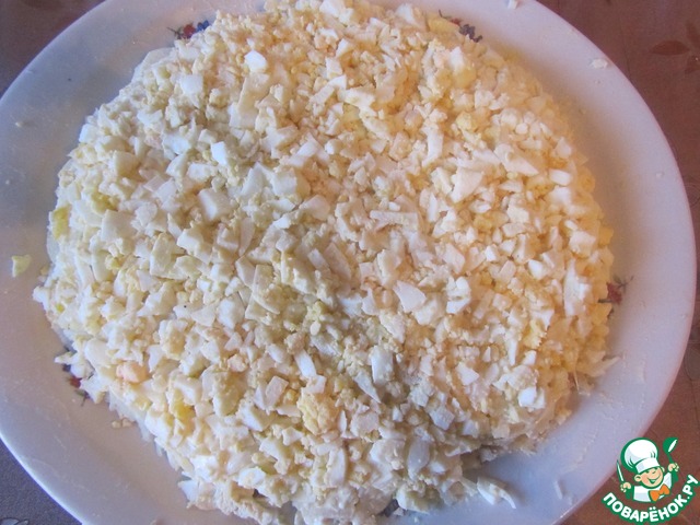Сверху лука выложить картофель, смазать майонезом и затем выложить яйца. Их тоже смазать майонезом.