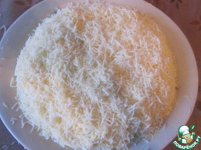 Сверху салат посыпать тертым сыром.