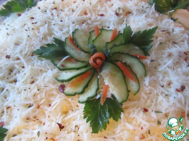 Украсить салат по Вашему вкусу. Я для украшения использовала сухую паприку, свежий огурец, морковь и зелень сельдерея.