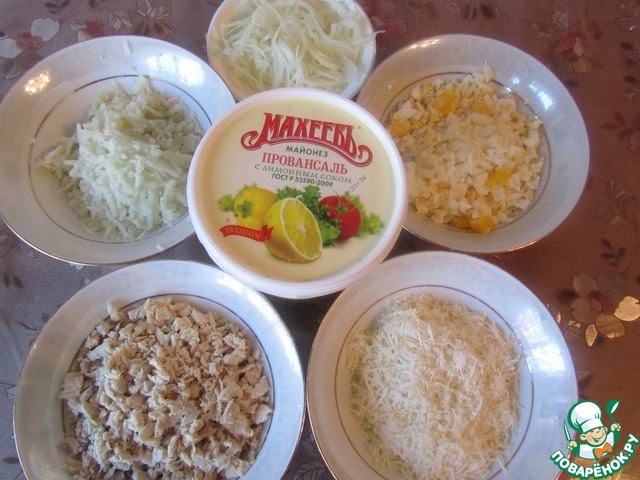 Отварную куриную грудку измельчить, отварные картофель и яйца натереть на крупной терке и немного подсолить, лук нарезать полукольцами и замариновать на 10 минут в растворе уксуса и воды. Майонез немного развести кипяченной водой, чтобы удобно было пропитывать слои.