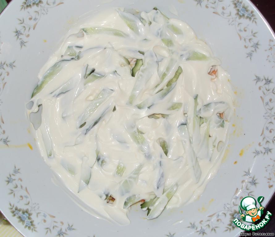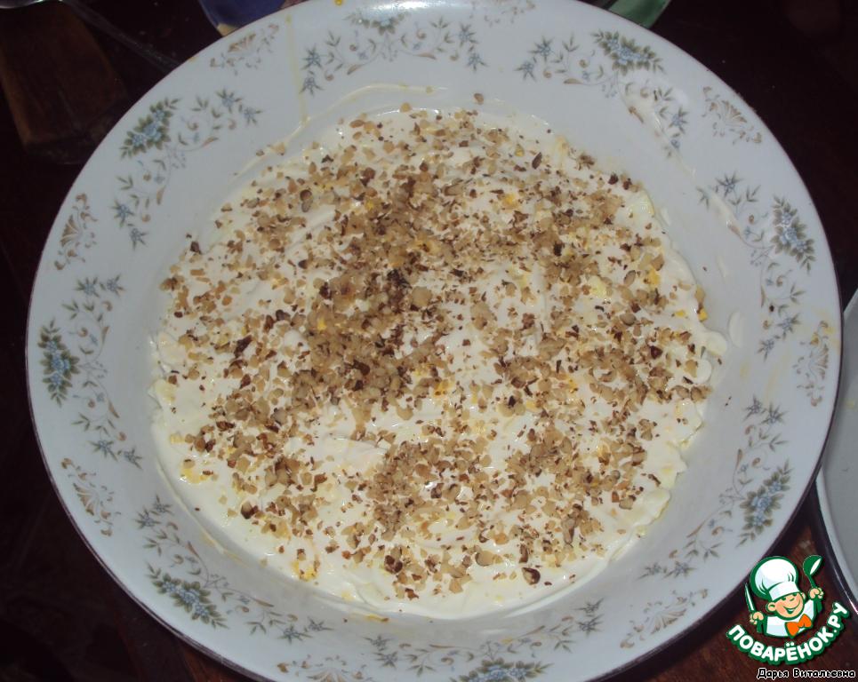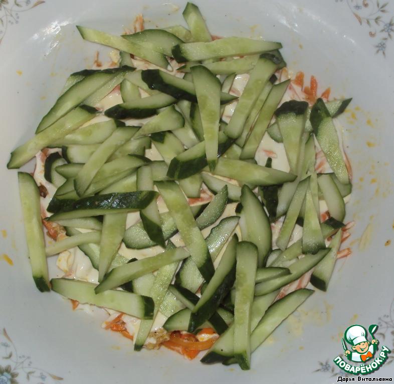 На большое плоское блюдо выложить слоями, промазывая майонезом, корейскую морковь,