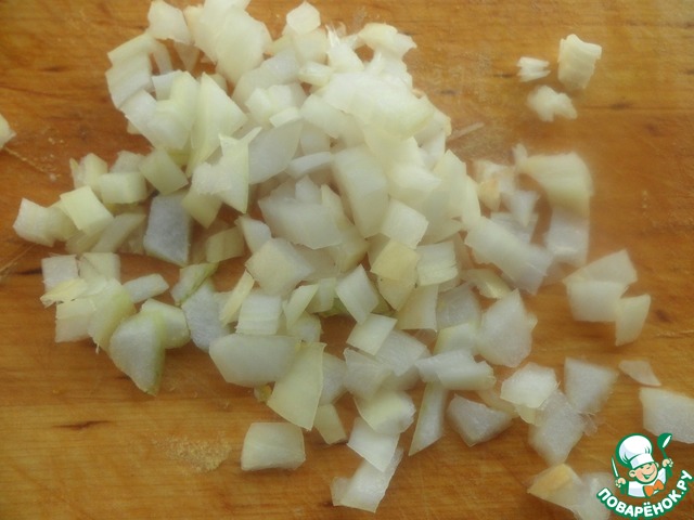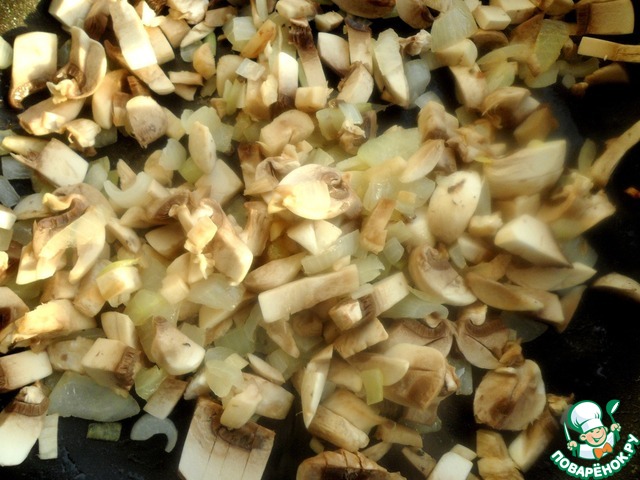 Обжарить ¾ мелко порезанной луковицы и шампиньоны до готовности, посолить, поперчить.
