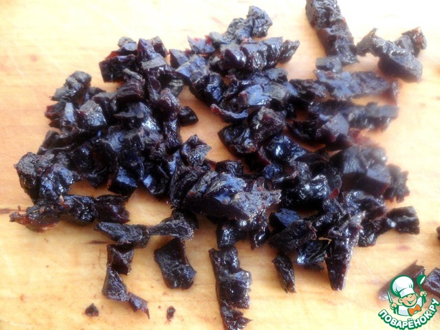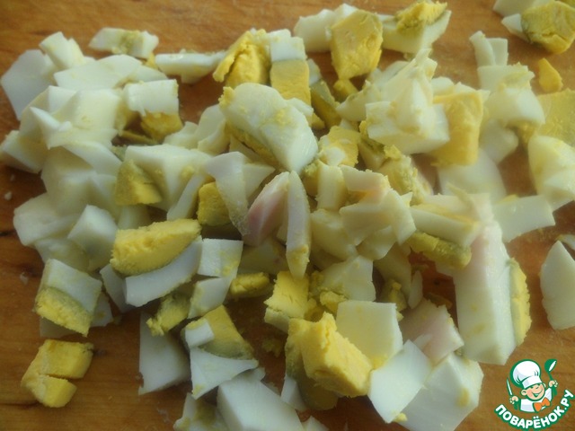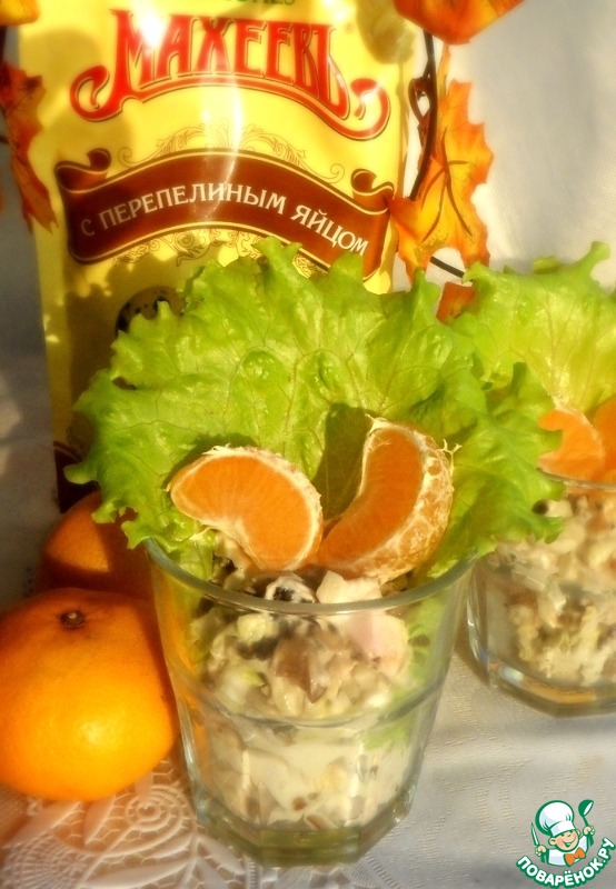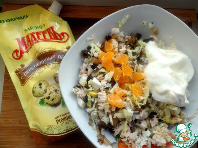 Начинку перемешать с порезанными кубиком мандаринами и 3 ст. л. майонеза Махеевъ с перепелиным яйцом.