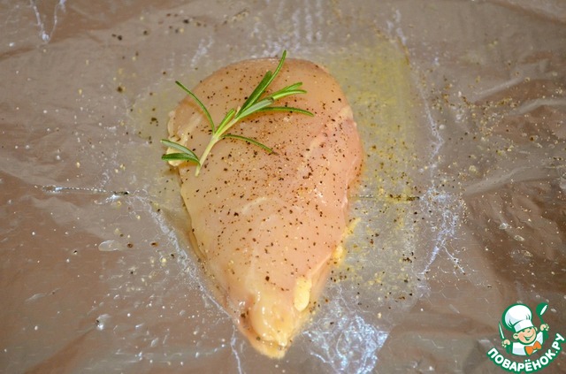 2. Куриное филе выложить на двойной слой фольги, полить апельсиновым соком, сбрызнуть оливковым маслом, посолить, поперчить, добавить веточку розмарина, завернуть в конверт. Повторить со вторым филе. Готовить в духовки при температуре 220С 35 минут.