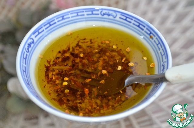 3. Оливковое масло смешать с 1 зубком чеснока, пропущенным через пресс, и хлопьями перца чили.