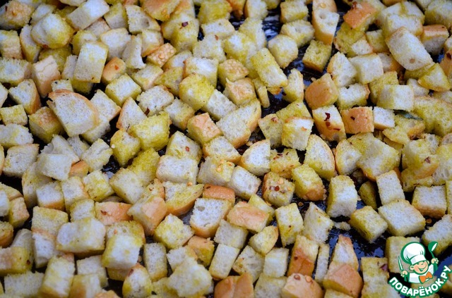 4. Залить получившейся смесью кубики багета, хорошенько размешать. Запекать в духовке при температуре 180С 10 минут, чтобы сухарики стали хрустящими и золотистыми.