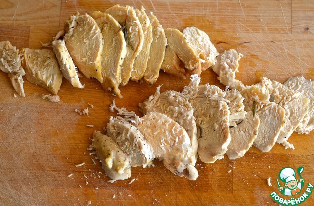 5. Готовое куриное филе порезать на кусочки средней толщины. Сок из фольги не выливать.