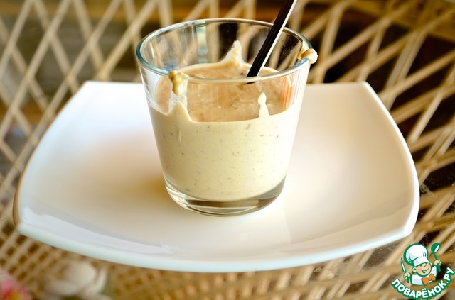 8. Для заправки: смешать майонез, сок лимона, мелко тертый пермезан, пропущенный через пресс зубок чеснока, сок, оставшийся в фольге от приготовления курицы, и мелко рубленные анчоусы. Положить всю массу в блендер и прокрутить до однородной массы.