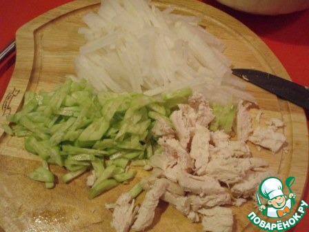 Дайкон и огурцы очистить от кожуры и нарезать тонкой соломкой.