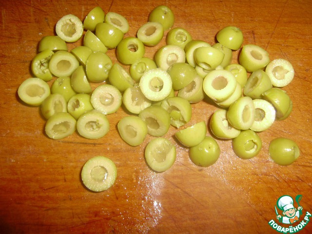 Оливки разрезаем поперек пополам.