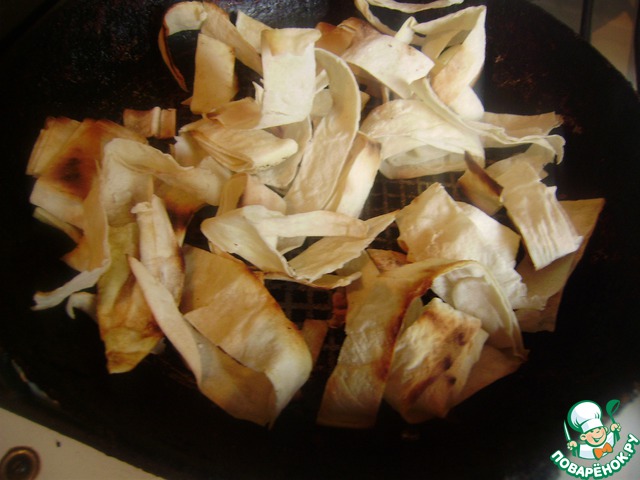 Прорезанный лаваш обжариваем на сухой сковороде до золотистого цвета.