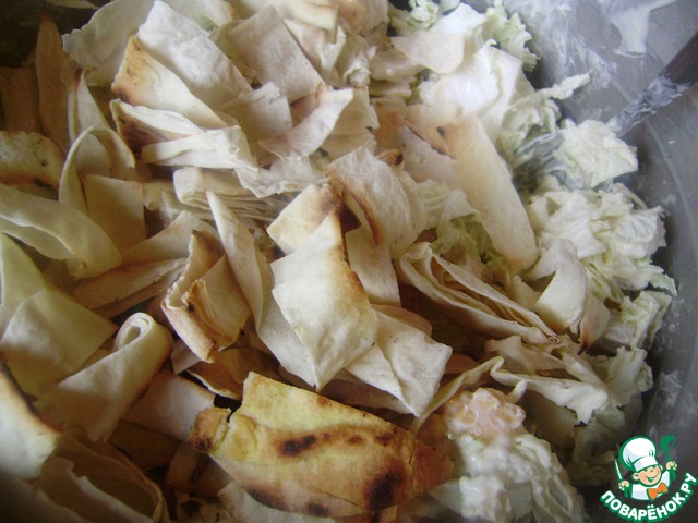 Все ингредиенты, кроме лаваша, смешиваем и заправляем майонезом. Не задолго до подачи добавляем лаваш и перемешиваем.
