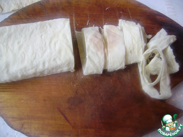 Лаваш скручиваем в рулет и нарезаем полосками
