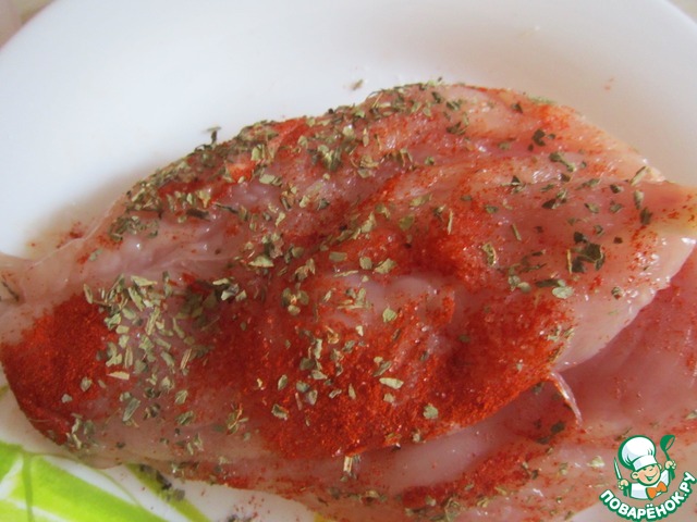 Смешать в плоской тарелочке сухие приправы (базилик и паприку) с солью. Обвалять куриное филе в этой смеси с двух сторон и обжарить на оливковом масле.