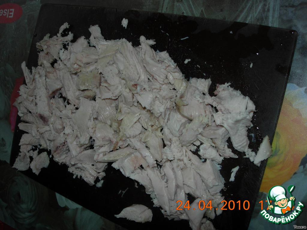 Куриную грудку отварить и нарезать произвольно (кубиками, соломкой).
