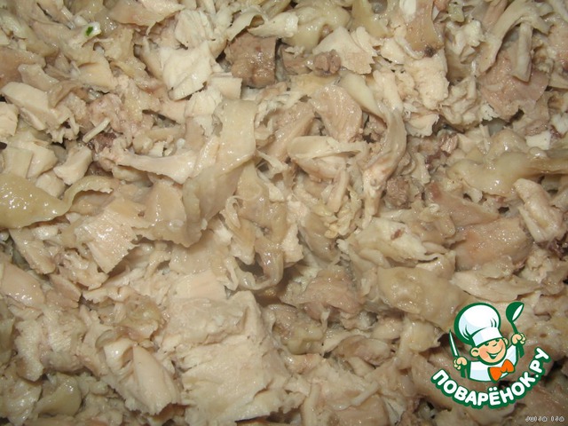 Отделяем курицу от костей, нарезаем соломкой (можно просто разобрать на волокна).