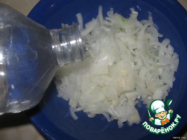 За время пока они варятся маринуем лук. Нарезаем его соломкой.